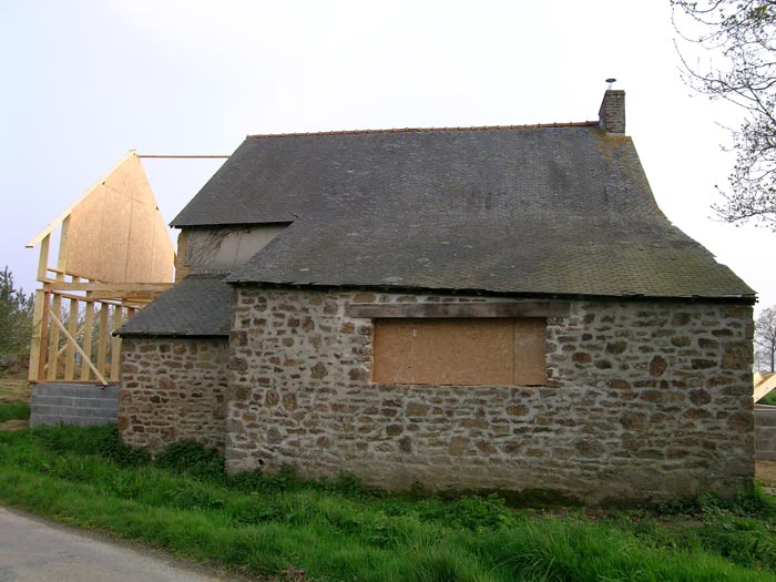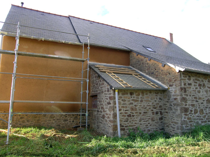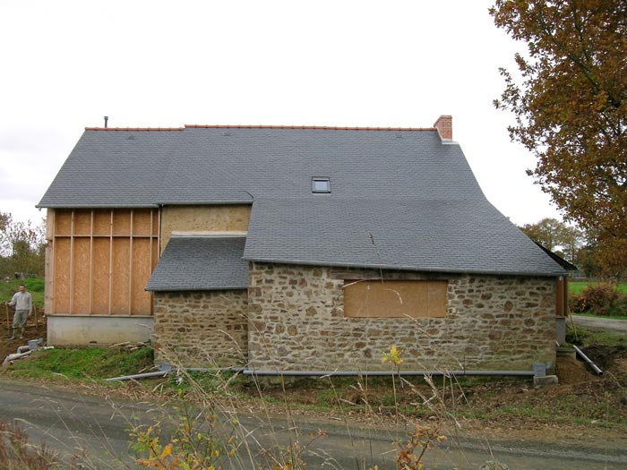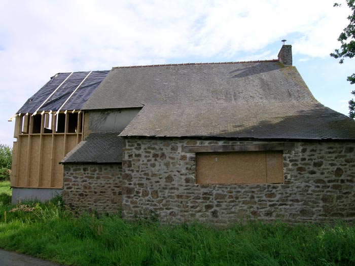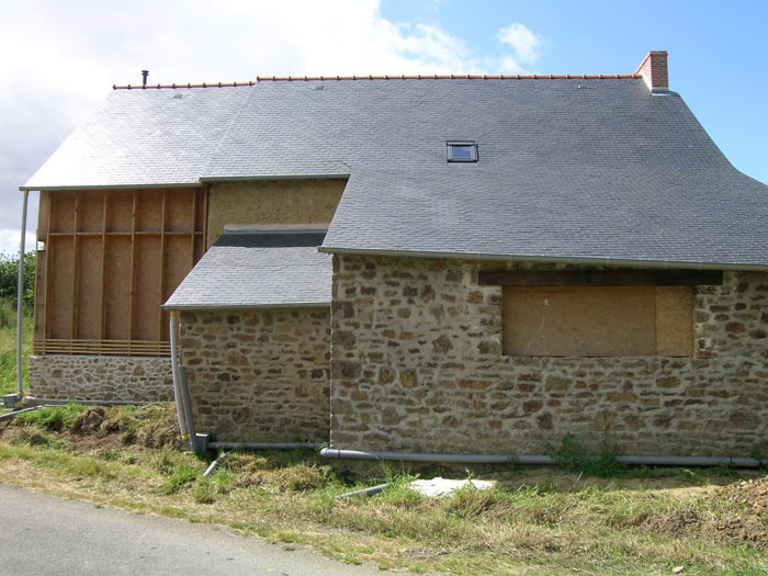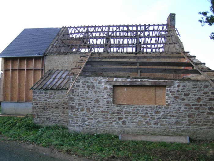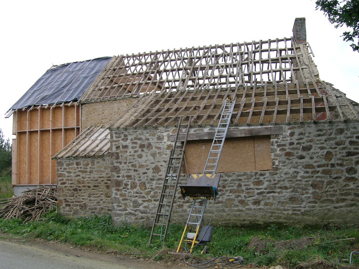 Changement des pannes de la cuisine par le charpentier + couverture commencée sur l'extension.