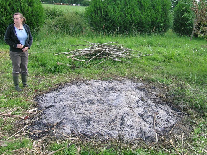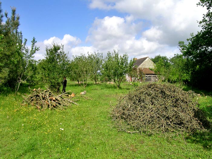 Sophie coupe ce qui dépasse.. Et fait des tas en prévision du prochain feu !