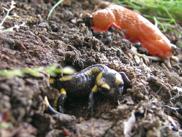 Sous une planche on a trouvé 2 bébés salamandre... Et comme d'habitude des limaces...