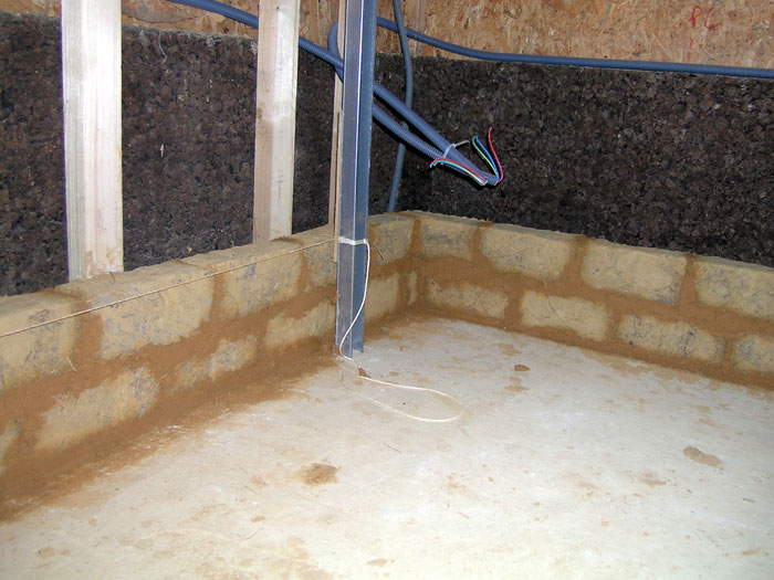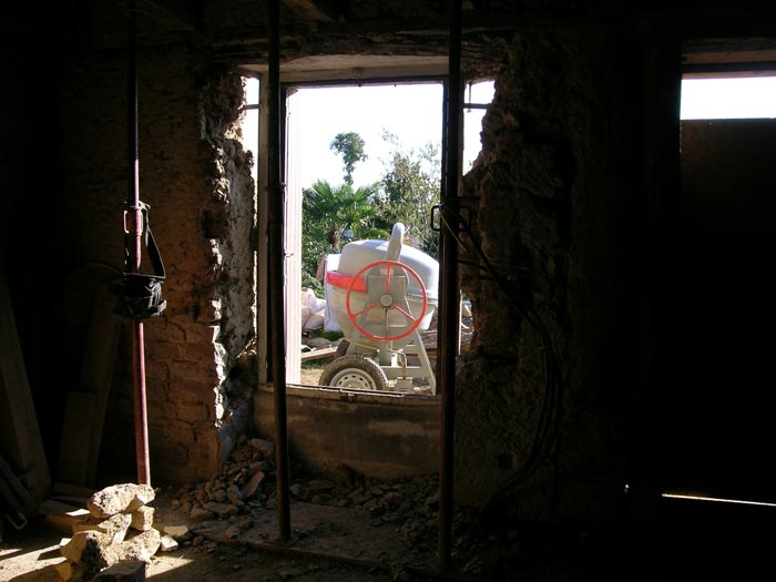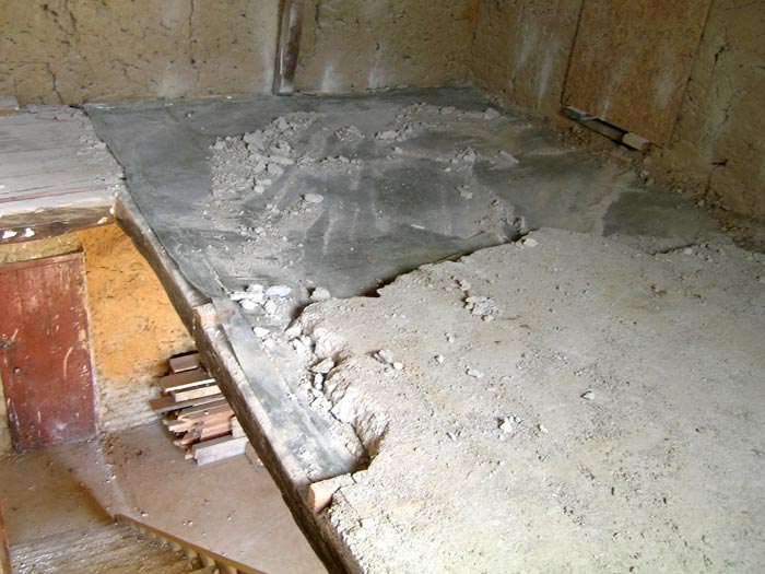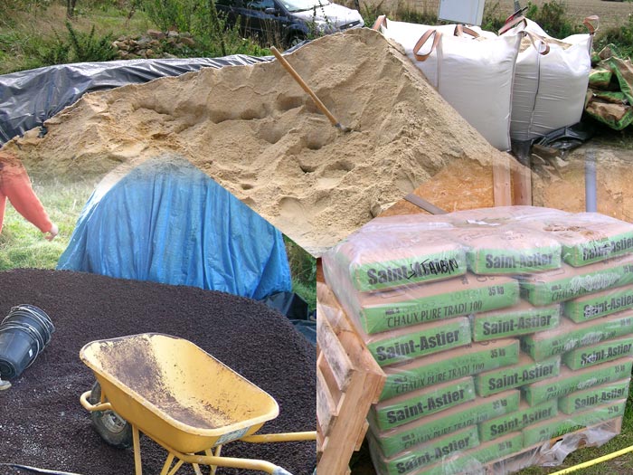 Recette de la dalle en béton de chaux : 1 sac de chaux, 4,5 seaux de sable, 5,5 seaux de pouzzolane... Merci Monique !