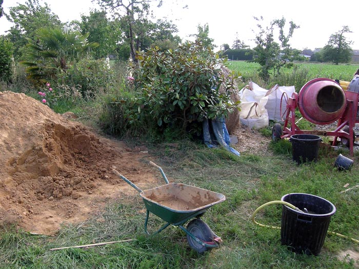 Après que le terrassier ait arraché une souche de mimosa contre la maison, il a fallu boucher le trou avec du béton !