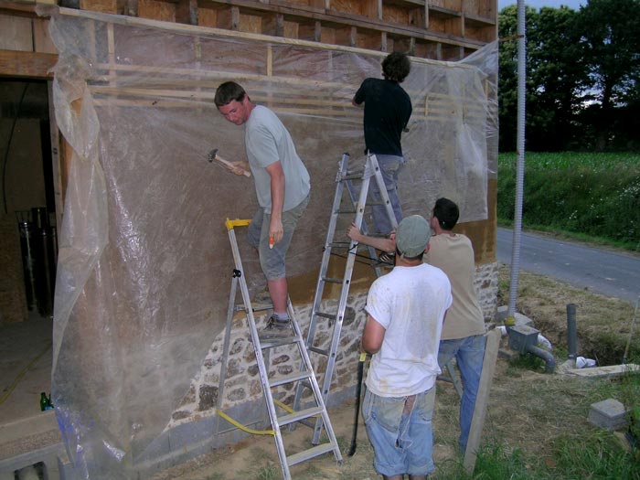 Alerte à l'orage, bâchage en 2 - 2 du mur en terre en cours de construction ! Pas de pluie sur le dessus du mur, on a dit !!!