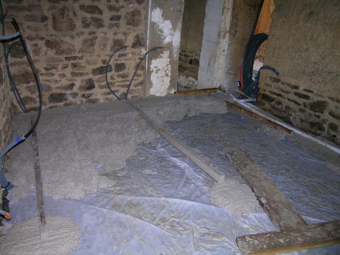 Voici les premières brouettes de béton de chaux versées dans la cuisine... Trop de plaisir !