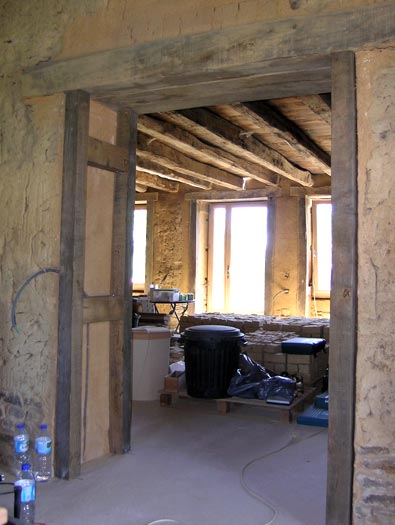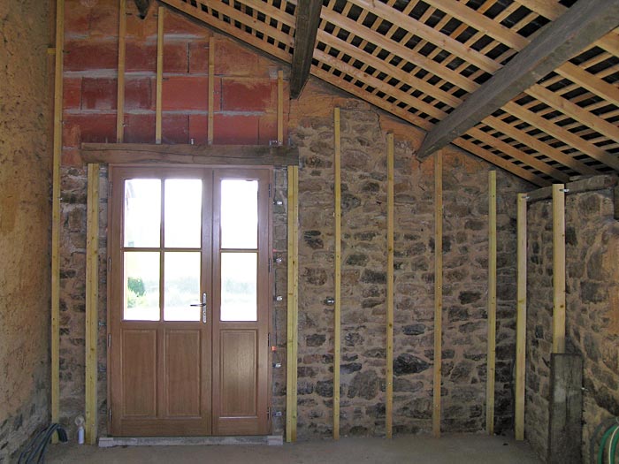 La porte d'entrée est posée ainsi que son linteau chêne. Nous avons attaqué une structure bois pour l'isolation.