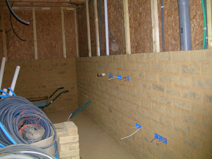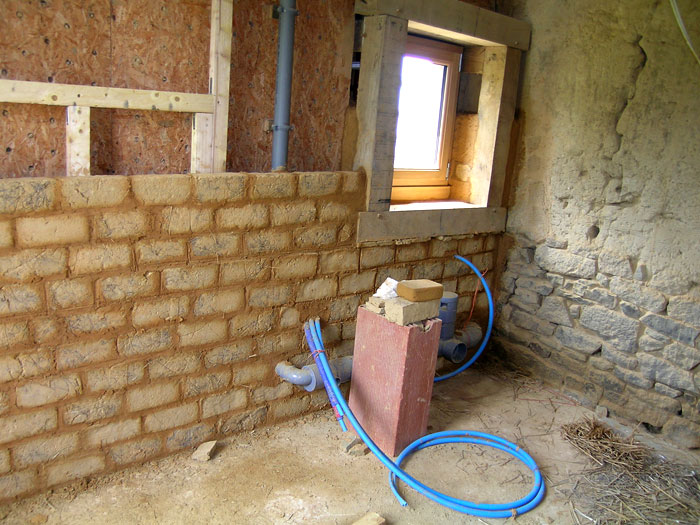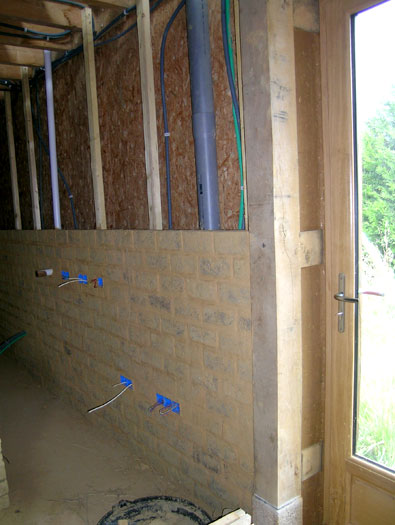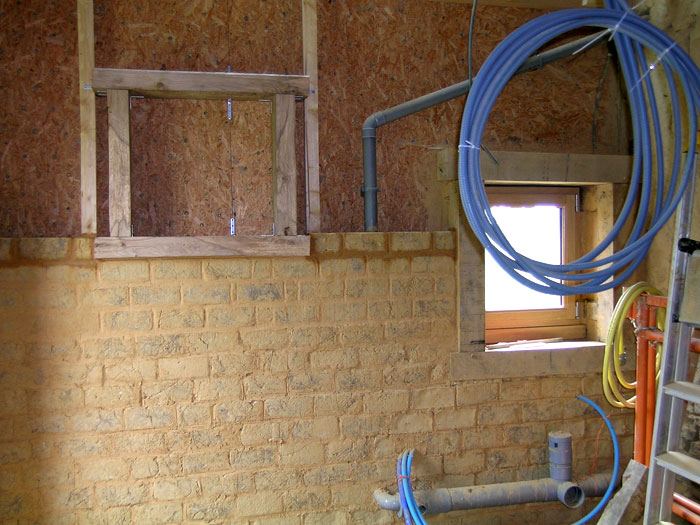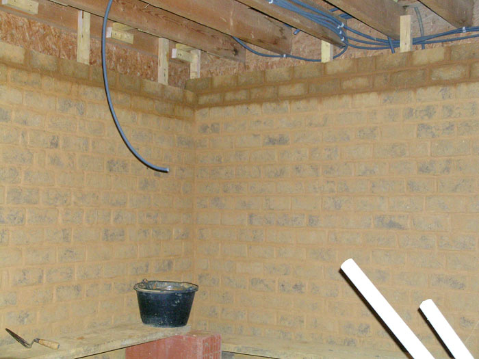 Doublage en briques de terre crue terminé au rez-de-chaussée.