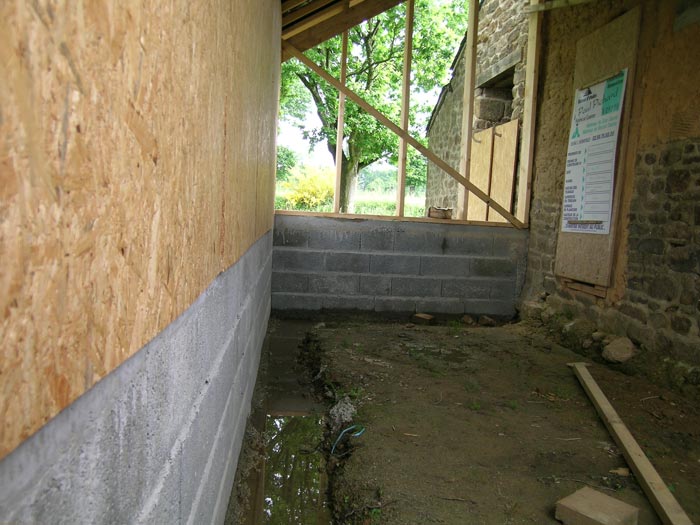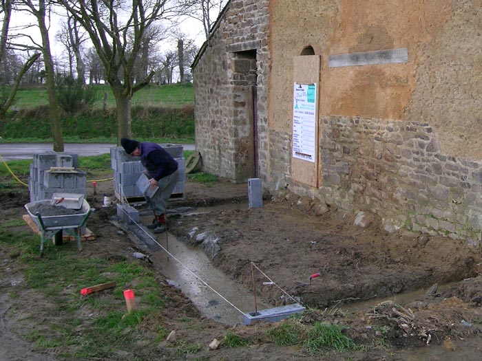 Yvon pose les premiers parpaings du sous bassement de la chambre d'amis ! Grand moment !