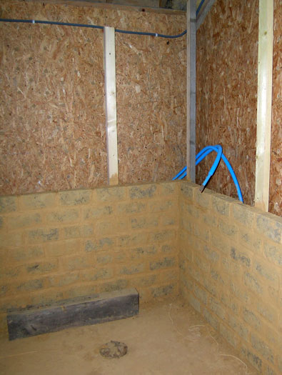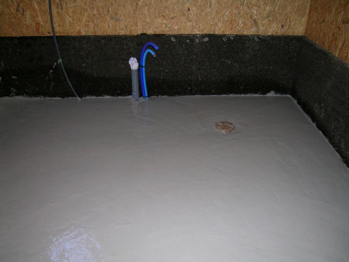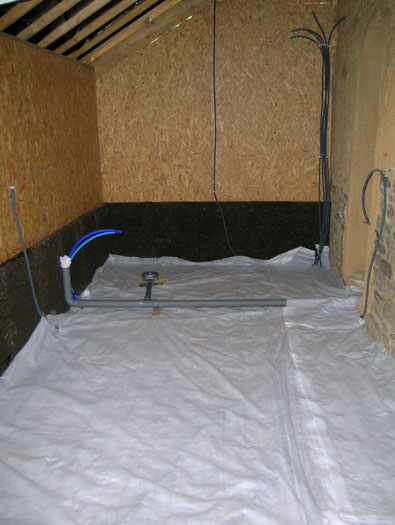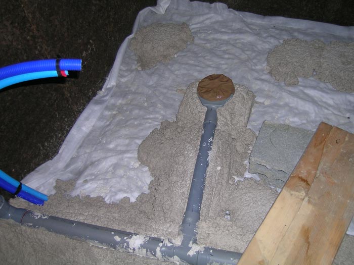 Pré-scellement du syphon de la douche dans le béton de chaux... J'espère qu'il est à niveau...